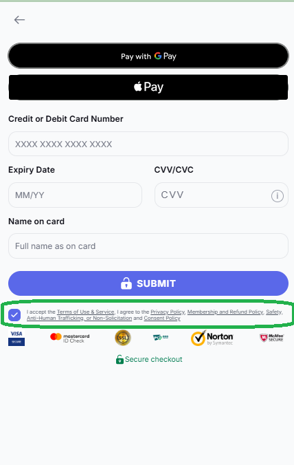 Accept our Terms of Use & Service, Privacy Policy, Membership and Refund Policy, Safety, Anti-Human Trafficking, or Non-Solicitation and Consent Policy, and enter your card details. After that, click on the "Submit" button to finalize the payment.